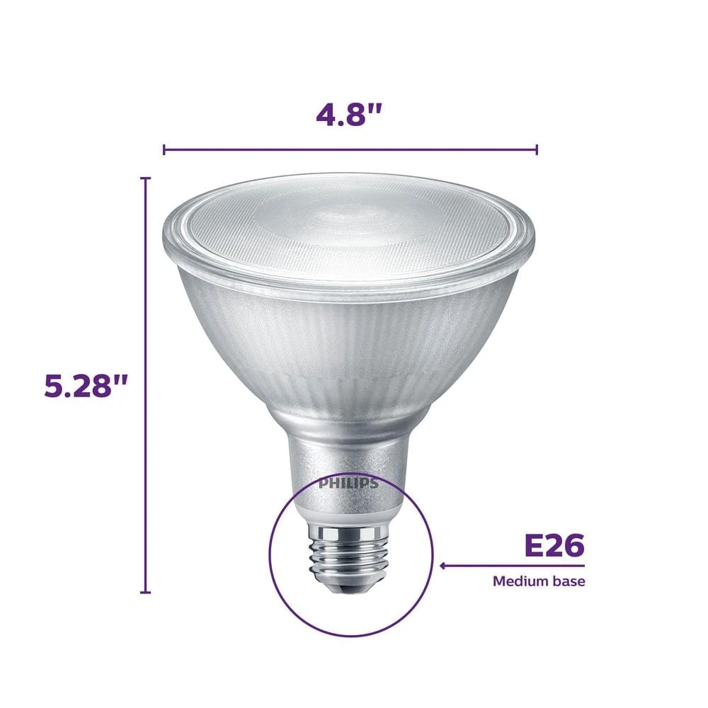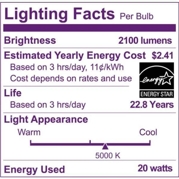 The LED PAR38 uses 20-Watt and produces 2100 Lumens of bright white illumination. It is an ideal equivalent for replacing a 250-Watt incandescent bulb. Its medium sized base fits any standard fixture easily and its color temperature of 5000K makes it ideal for indoor and outdoor usage. Its long-rated life 25,000 hours reduces need for replacement and other maintenance costs.