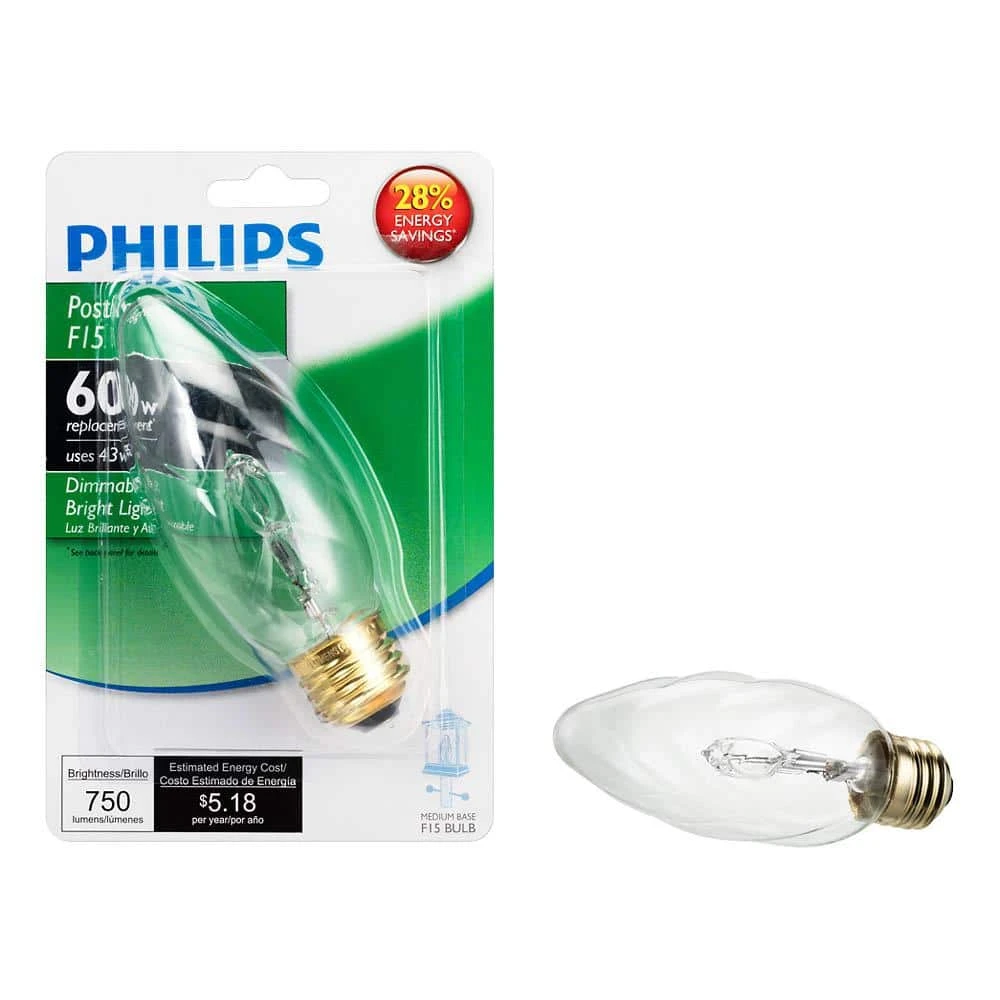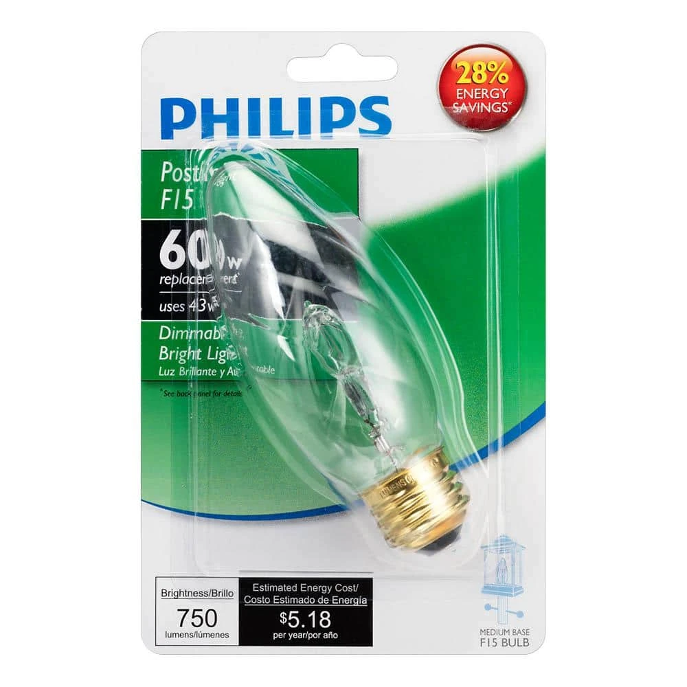 The EcoVantage 60W Equivalent Clear Post light F15 Light Bulb is an energy-saving alternative to a standard incandescent F15 light bulb. Using only 43-Watt of energy, it uses 28% less energy. Ideal for use in Post light fixtures to illuminate your pathway or porch at night.