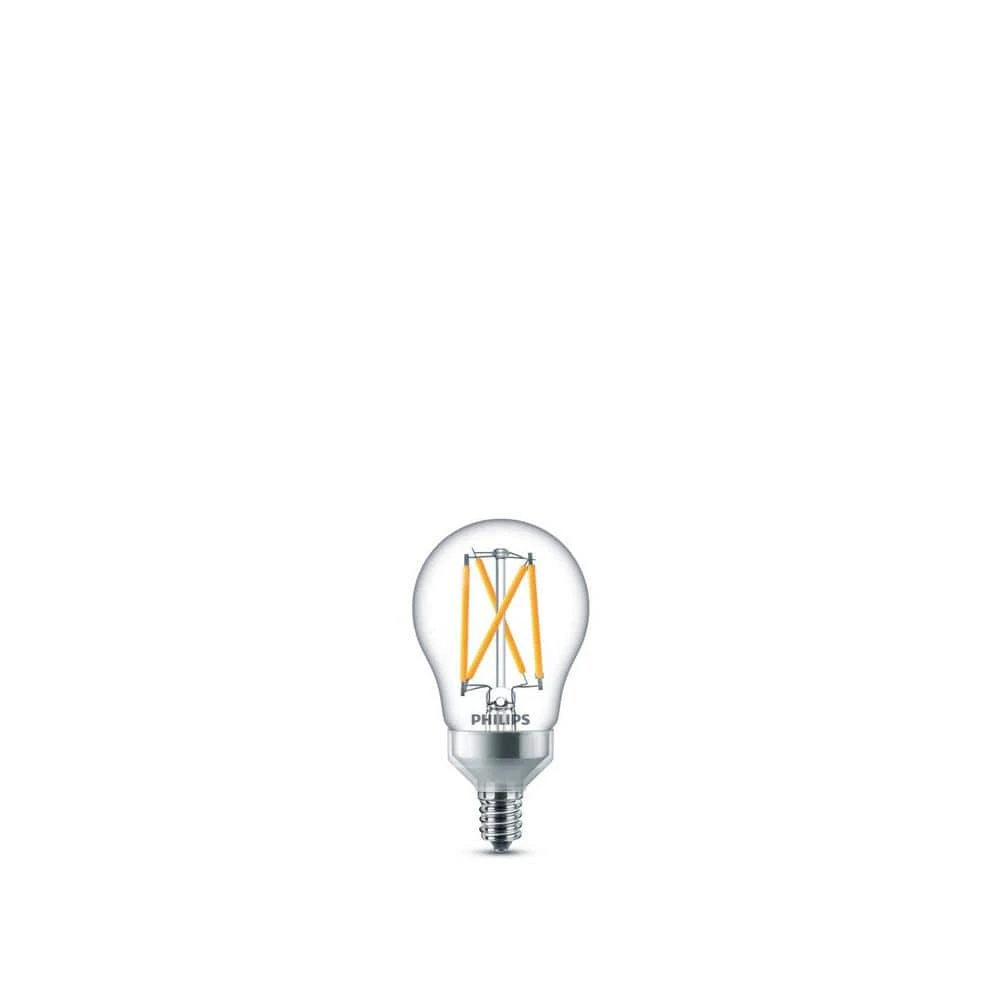 The more you dim, the warmer the light with the Philips 5.5-Watt A15 Fan bulb LED candle featuring Diamond Spark technology and Warm Glow light effect. This new Philips LED fan light bulb offers the elegant sparkle effect of incandescent light bulbs and a new experience for dimming by creating a soft, diffused light and smooth dimming range from 2700K – 2200K. As the light is dimmed, the color temperature of the bulb is reduced and creates a warm, relaxing ambiance. The Diamond Spark technology use in the bulb utilizes a prism design that enhances bulb aesthetic and improves light quality. The prism, similar to a filament, simulates incandescent-like sparkle desired in decorative applications around your home. Ideal for use in ceiling fans or wall sconces for rooms like your kitchens, dining rooms, family rooms and hallways, this Philips LED candle delivers a soft white light, is fully dimmable and can replace your current 40-Watt fan bulb. Add a touch of sparkle to your home decor with Philips with Diamond Spark technology.