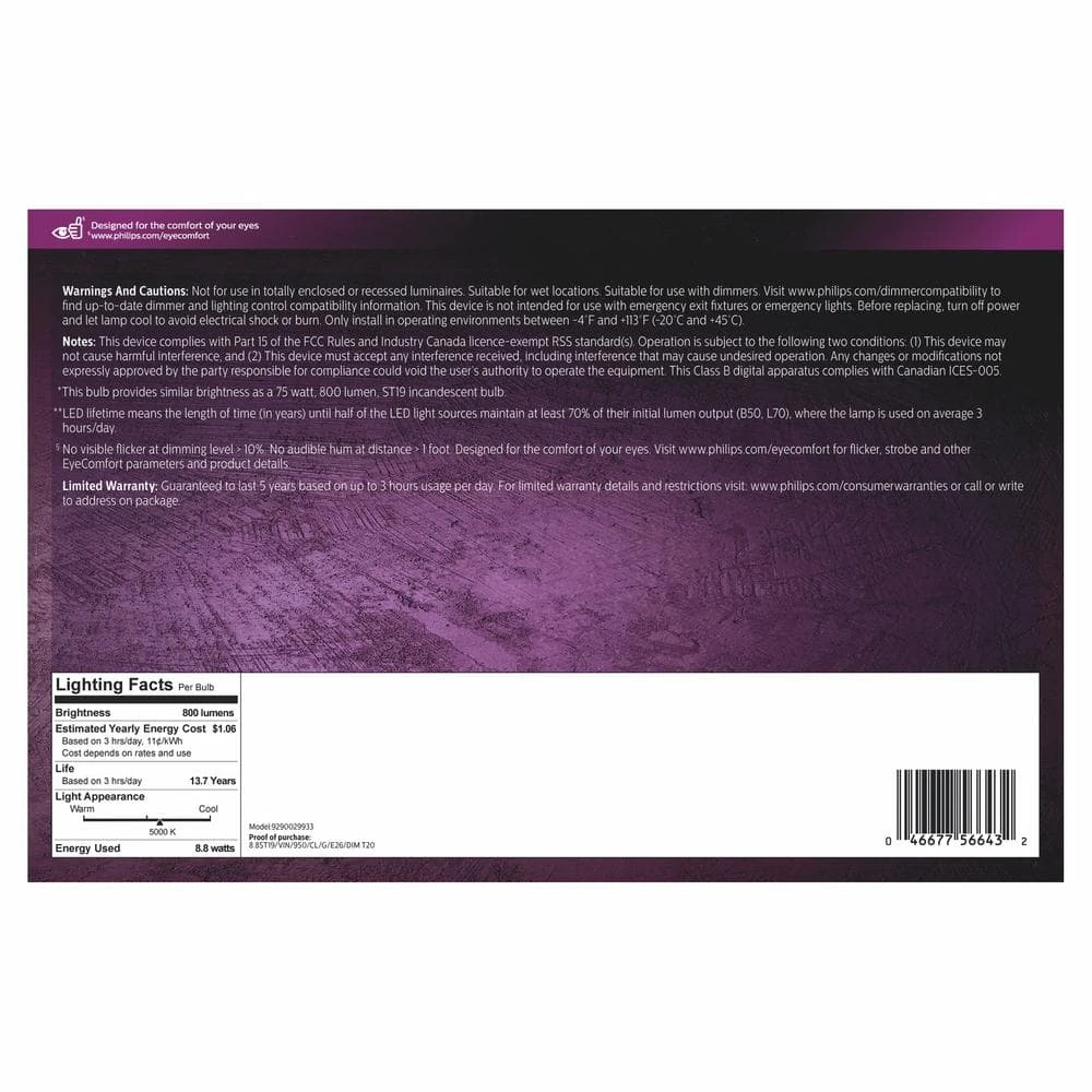 This Vintage LED Clear Spiral Filament bulb is designed to be seen. This nostalgia-inspired dimmable LED bulb allows you to create a refreshing ambience with daylight tones. Vintage LED bulbs also meet Philips EyeComfort criteria, a standard we developed to measure our products against a set of key factors that can impact the comfort of your eyes.