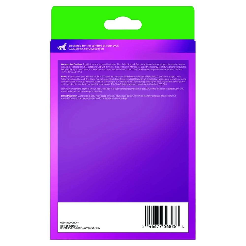 This Philips LED bulb lights up in bright green, while offering the benefits of lifetime and energy savings of LED technology. Great for parties and holidays. Lights up a vibrant color, to create custom environments for special occasions. With a lifetime of over 10,000-hours, use the same bulb to mark the event for years to come.
