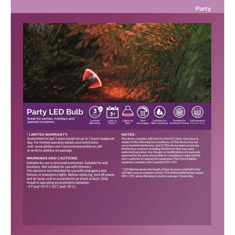 This Philips LED bulb lights up in bright red, while offering the benefits of lifetime and energy savings of LED technology. Great for parties and holidays. Lights up a vibrant color, to create custom environments for special occasions. With a lifetime of over 10,000-hours, use the same bulb to mark the event for years to come.