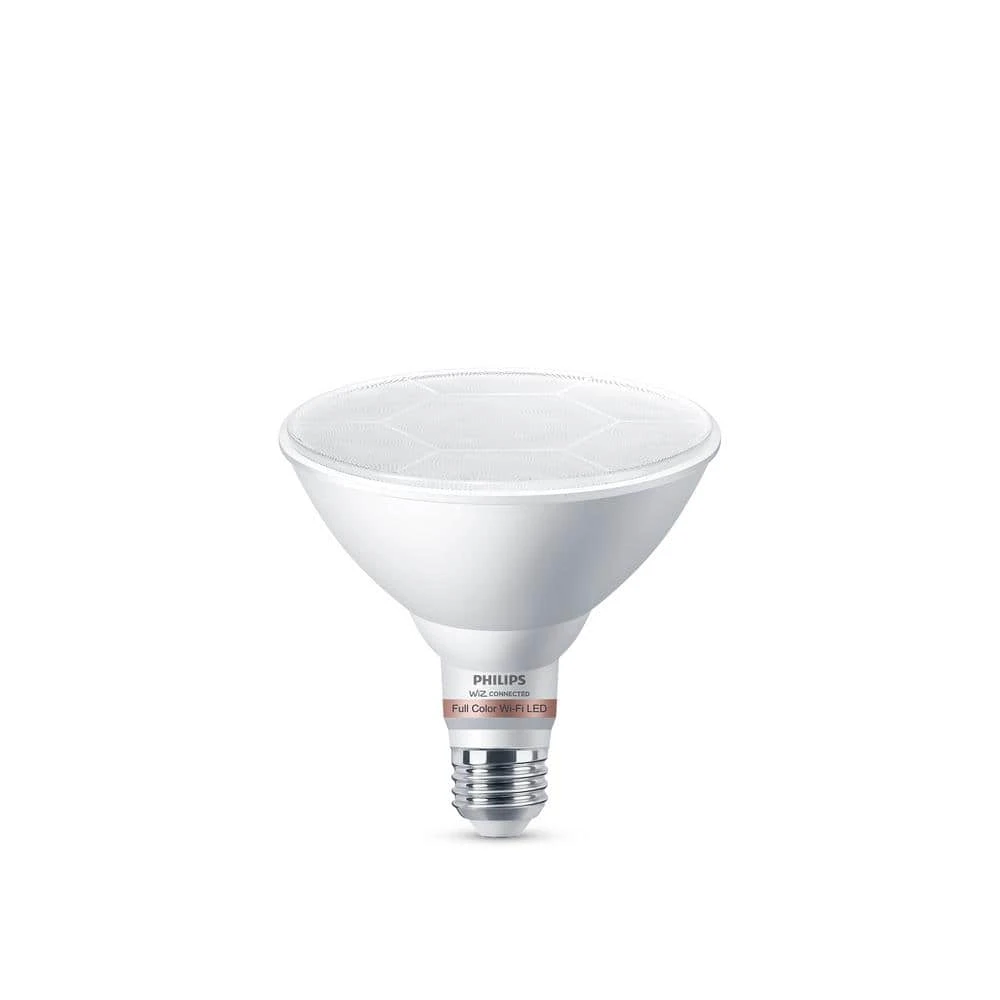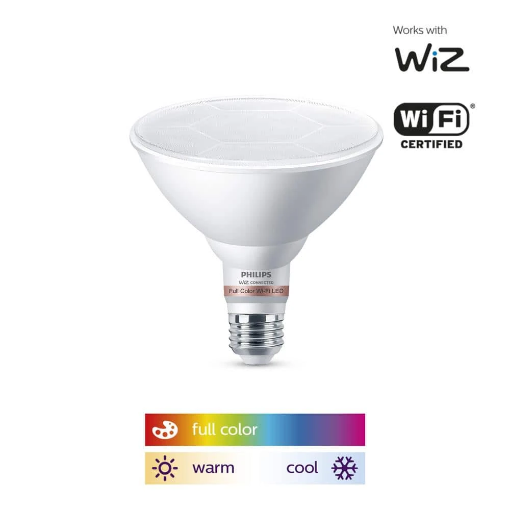 Philips Smart Wi-Fi LED lighting puts you in complete control of your lighting with smart bulbs that are easy to use, functional and affordable. We’ve made all of your favorite high-quality Philips bulbs smarter, just connect them to your existing Wi-Fi network. This Smart Color PAR38 bulb lets you live life colorfully. Dynamic light modes make any room glow in your favorite color. or use smart tunable white light that adjusts from relaxing warm white to energizing cool-daylight. Use app presets to choose the perfect lighting for your daily activities. with Philips Smart Wi-Fi LED tunable lighting you can play with thousands of shades of white and color and enjoy pre-set well-being modes to find the perfect light temperature. Control your lights wherever you are using the WiZ app or your favorite compatible voice control device. This product requires a Wi-Fi connection to operate wirelessly.
