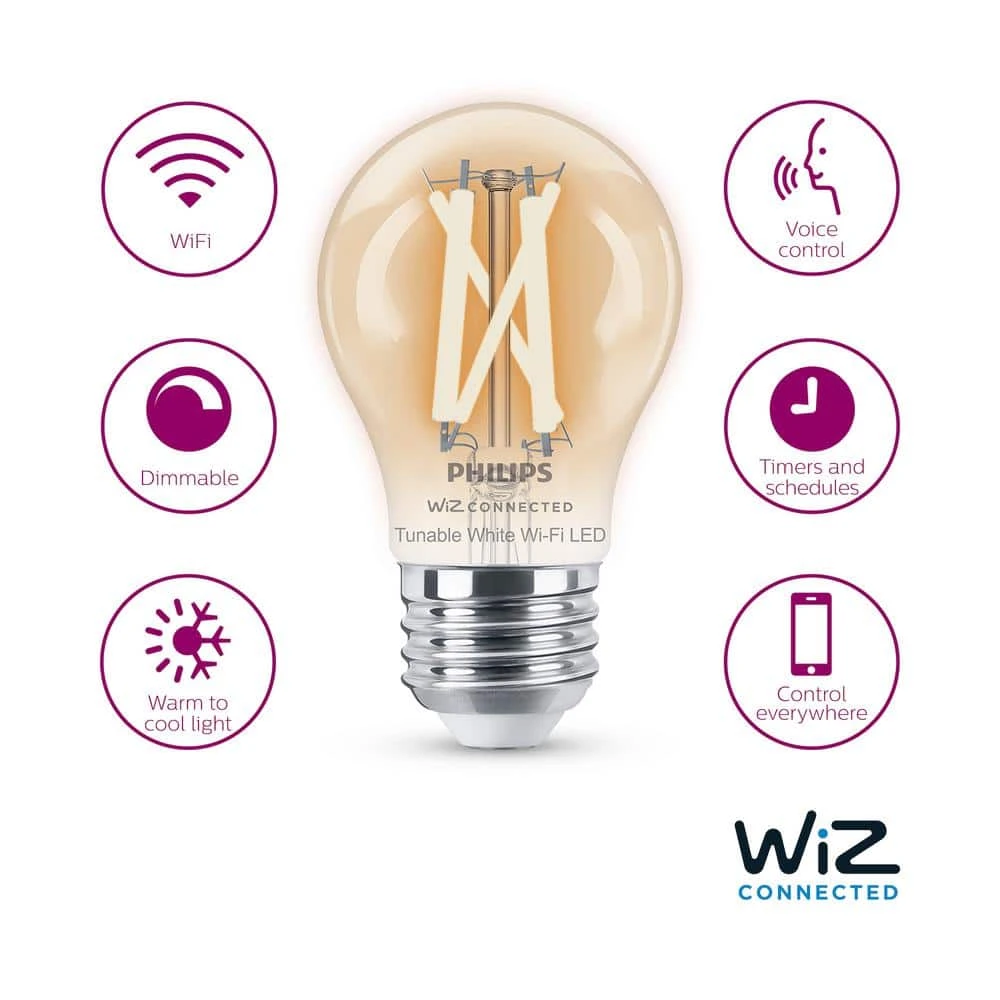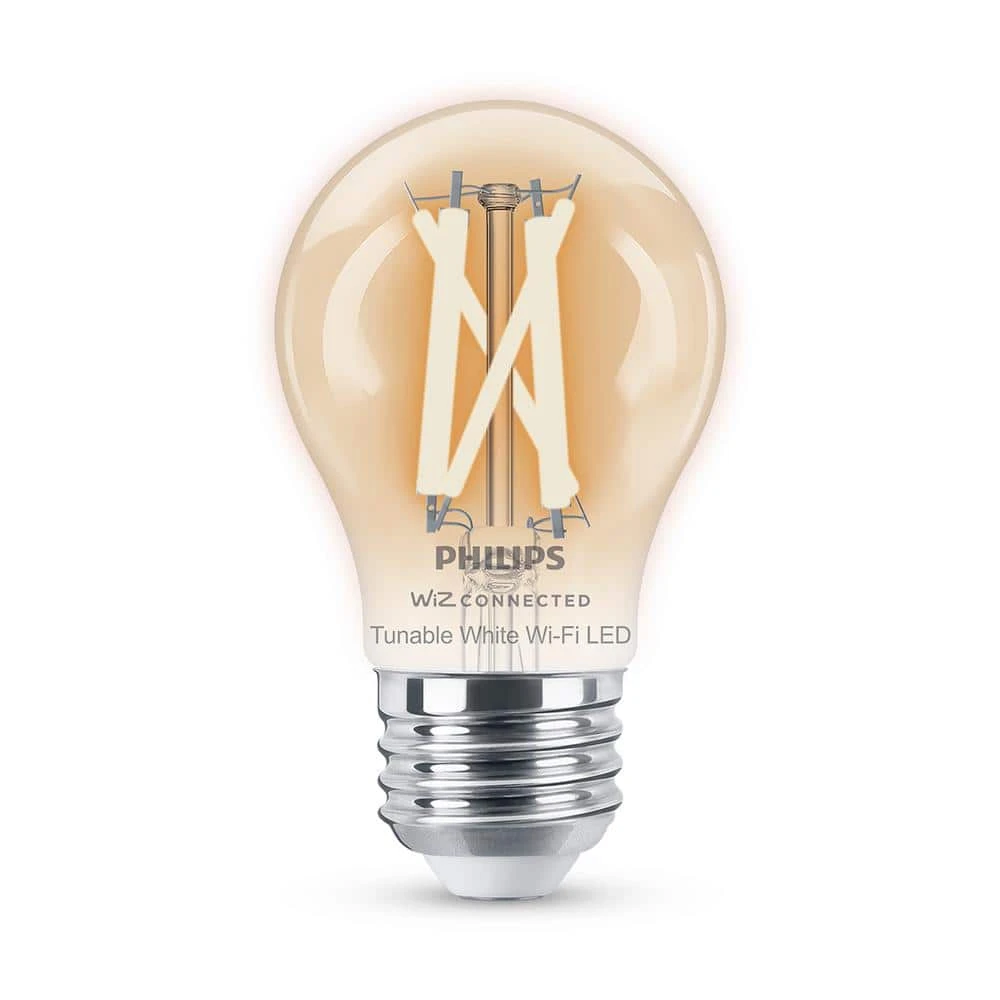 Philips Smart Wi-Fi LED lighting puts you in complete control of your lighting with smart bulbs that are easy to use, functional and affordable. We’ve made all of your favorite high-quality Philips bulbs smarter, just connect them to your existing Wi-Fi network. This Filament A15 Clear Tunable White E26 lets you enjoy light that adjusts from relaxing warm white to energizing cool-daylight. Use app presets to choose the perfect lighting for your daily activities. with Philips Smart Wi-Fi LED tunable lighting you can play with thousands of shades of white and enjoy pre-set well-being modes to find the perfect light temperature. Control your lights wherever you are using the WiZ app or your favorite compatible voice control device. This product requires a Wi-Fi connection to operate wirelessly. Compatible with WiZ apps and products along with Google Assistant, Amazon Alexa and Siri Shortcuts.