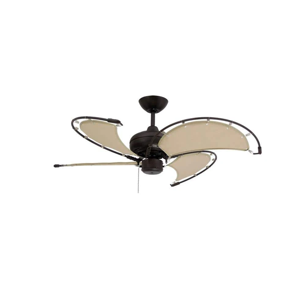 Voyage 40 in. Outdoor Oil Rubbed Bronze ceiling fan has a causal beachside style perfect for porches and patios. Four semi-circular blades arch out from the housing creating a 40 in. blade sweep. And for a finial nautical touch, khaki canvas material is stretched along the spring frame blades.